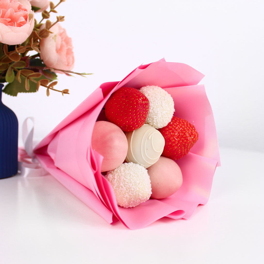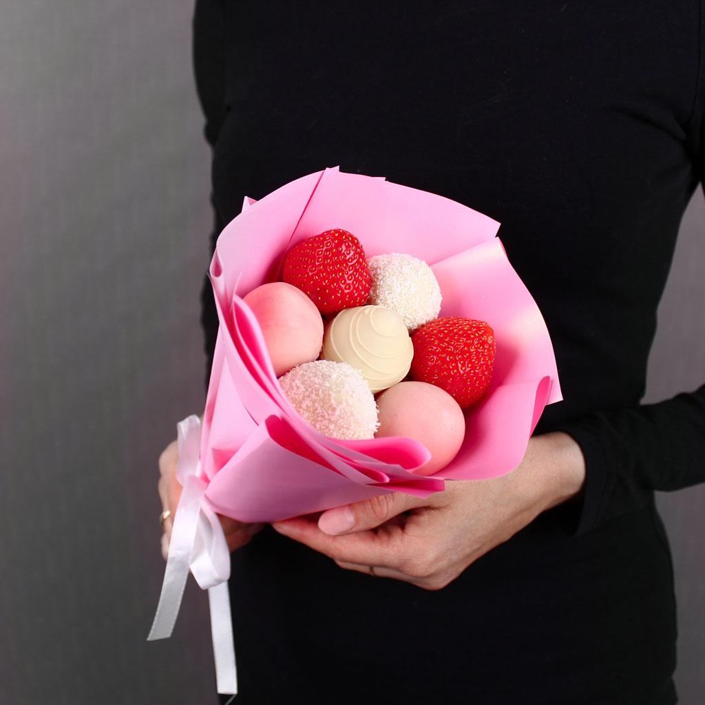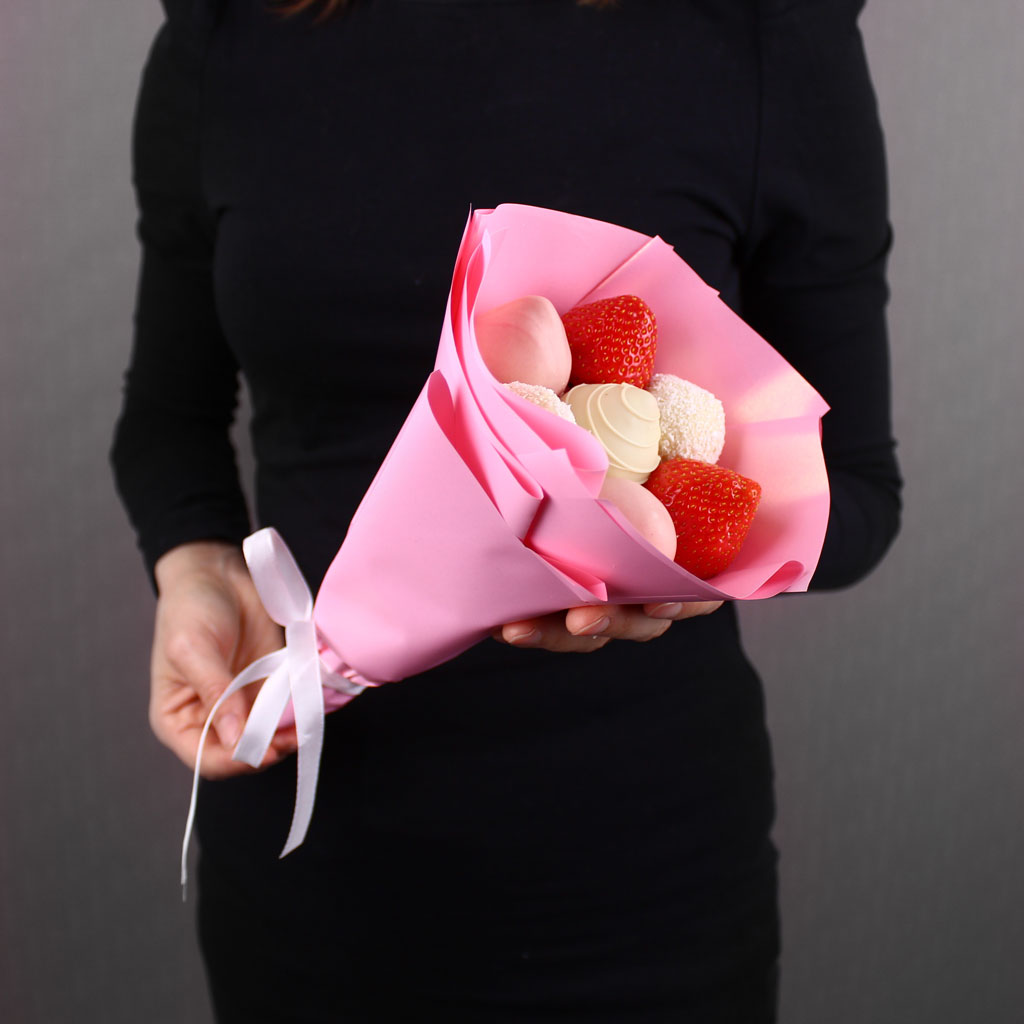 Сочетание сочной клубники, сливочного белого шоколада и воздушного кокоса — это беспроигрышная формула нежности. Небольшой размер букета делает его уместным для любого, даже самого скромного повода, а розовая упаковка добавляет ту самую долю эстетики, которая превращает простой десерт в продуманный комплимент.