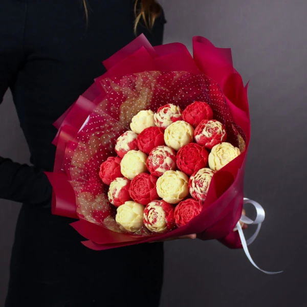 Бордовый цвет упаковки добавляет глубины и солидности, превращая яркую композицию в изысканный презент. Вы дарите не просто сладости, а продуманную эстетическую формулу, где важен каждый элемент: от игры цвета в бутонах до богатого оттенка упаковки. Это выбор для тех, кто не боится выражать чувства ярко и со вкусом.
