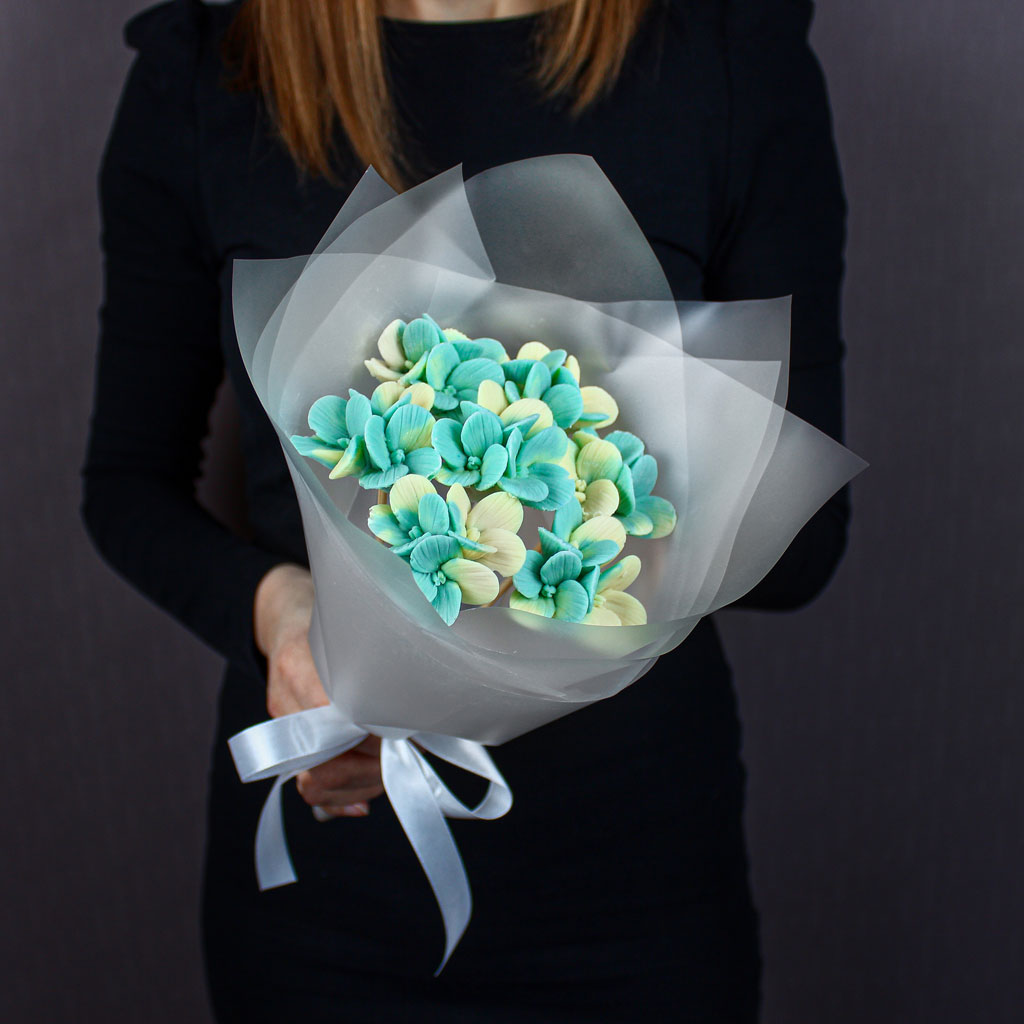 Нежные соцветия гортензий, выполненные из бельгийского шоколада, поражают проработкой каждой детали. Игра бело-голубых оттенков создает эффект хрустальной свежести и прохлады. Упаковка в белой флористической пленке добавляет композиции воздушности и завершенности, делая её похожей на произведение искусства.