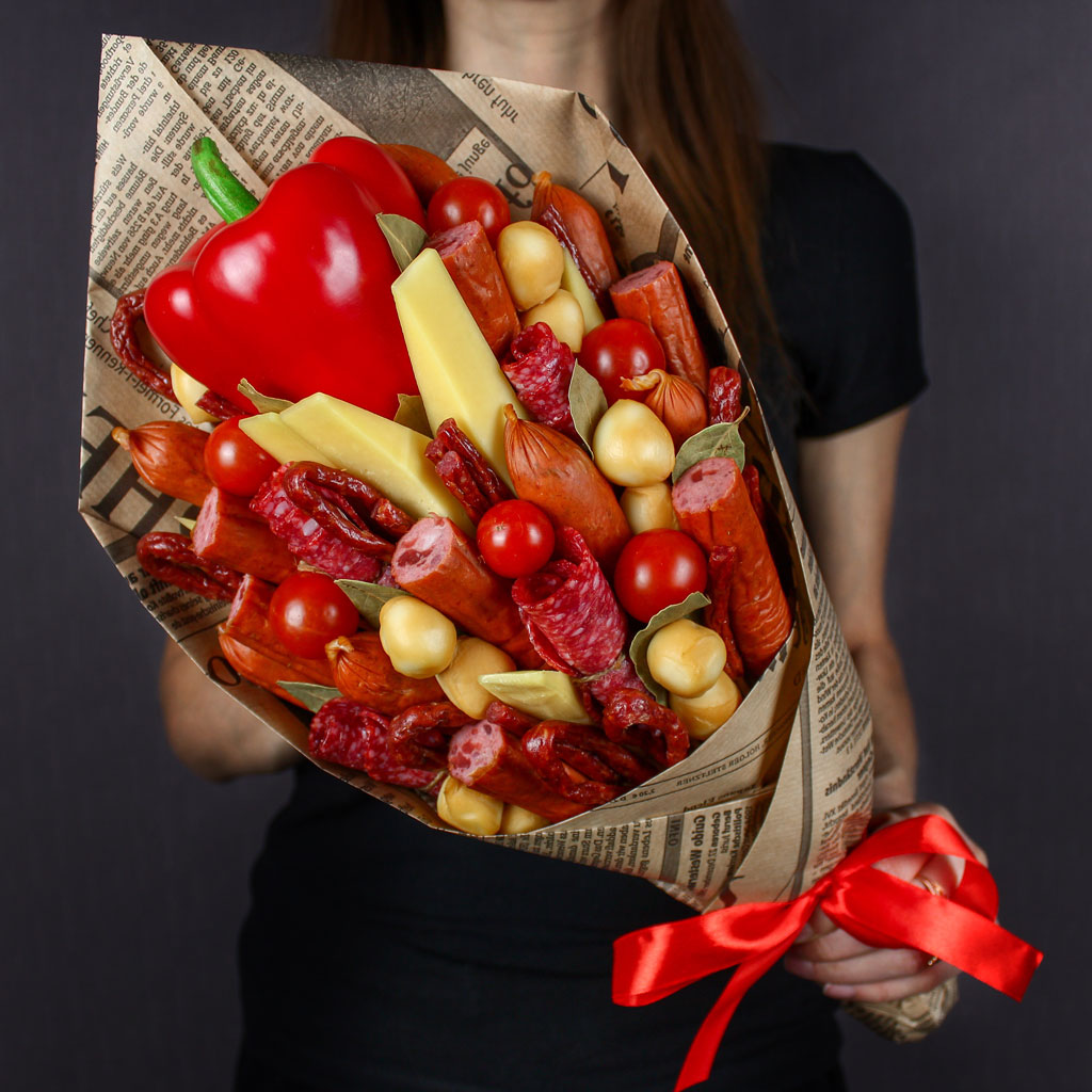 Заряжен энергией и готов к гастрономическому штурму! Этот букет в дерзкой газетной упаковке сочетает мощь охотских колбасок, насыщенность сыров и свежесть овощей. Для тех, кто ценит стремительный напор вкусов и смелые решения.